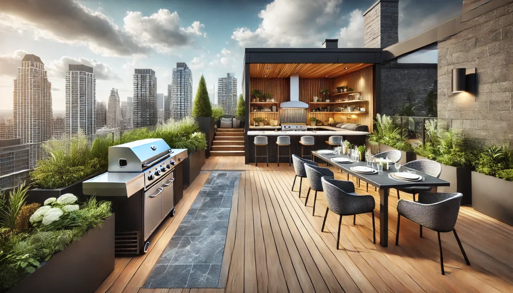 Uma das utilizações mais populares das lajes transformadas em áreas de lazer é a criação de um espaço gourmet. Instalar uma churrasqueira e, se possível, uma pequena cozinha externa, é uma excelente maneira de aproveitar o espaço.